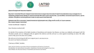 Anestēzijas intensīvās un neatliekamās aprūpes māsu Baltijas biedrību biedru vārdā izrādām solidaritāti un atbalstu Ukrainas iedzīvotājiem un saviem kolēģiem. Mēs esam pret šo vardarbību, un šis ļaunais karš ir noziegums pret visu, kas mums ir dārgs. Mēs patiesi vēlamies palīdzēt jums mūsu iespēju robežās.