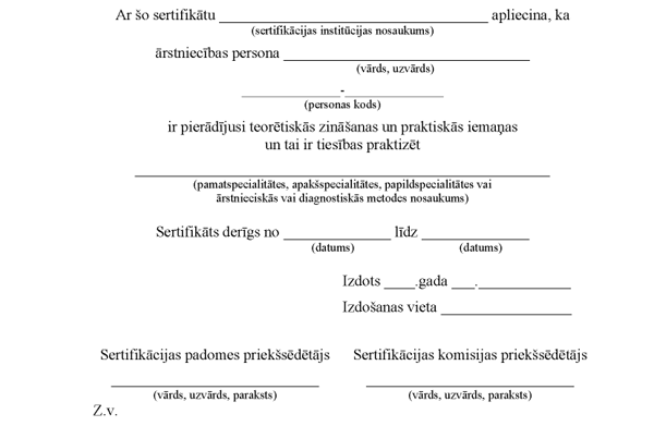 8.3. ja sertifikātu izsniedz pēc sekmīgi nokārtota sertifikācijas eksāmena gadījumā, ja ārstniecības personai bijusi atteikta resertifikācija, numuru veido latīņu alfabēta burti “AE” un pieci arābu cipari.