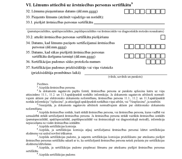33. Sertifikācijas padome septiņu darbdienu laikā pēc šo noteikumu 32.punktā minētā priekšlikuma saņemšanas pieņem lēmumu par atteikumu piešķirt sertifikātu vai atļauj sertificējamai ārstniecības personai kārtot sertifikācijas eksāmenu. Pieņemto lēmumu norāda sertifikācijas lapā (2.pielikums). Lēmumu par atteikumu piešķirt sertifikātu sertifikācijas padome sertificējamai ārstniecības personai paziņo Paziņošanas likumā noteiktajā kārtībā. Atļauju sertificējamai ārstniecības personai kārtot sertifikācijas eksāmenu šajos noteikumos noteiktajā kārtībā sagatavo sertifikācijas komisija.