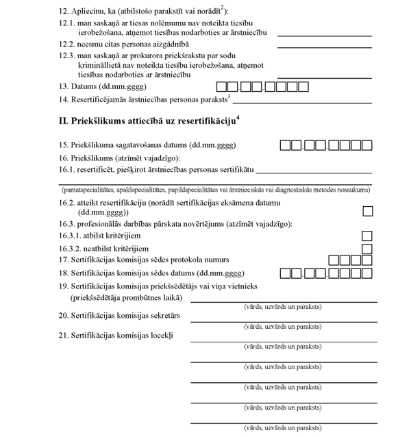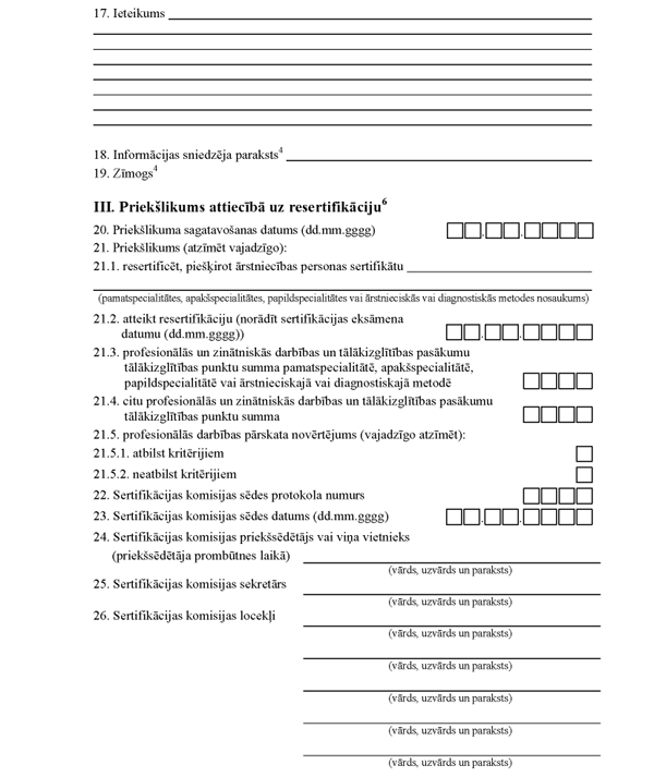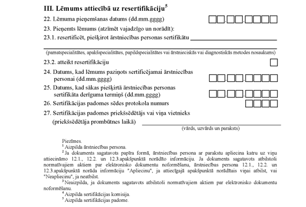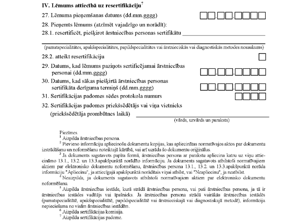 72. Sertifikācijas komisija piecu darbdienu laikā pēc sertifikācijas komisijas sēdes norises dienas sertifikācijas komisijas sēdes protokolu un resertifikācijas lapu ārstniecības personai, kura profesionālo darbību ilgstoši veikusi ārpus Latvijas Republikas kādā no Eiropas Savienības dalībvalstīm (4.pielikums), iesniedz sertifikācijas padomei. Sertifikācijas padome septiņu darbdienu laikā pēc sertifikācijas komisijas priekšlikuma saņemšanas pieņem lēmumu par resertificējamās ārstniecības personas resertifikāciju vai par atteikumu veikt resertifikāciju. Pieņemto lēmumu norāda resertifikācijas lapā ārstniecības personai, kura profesionālo darbību ilgstoši veikusi ārpus Latvijas Republikas kādā no Eiropas Savienības dalībvalstīm (4.pielikums).